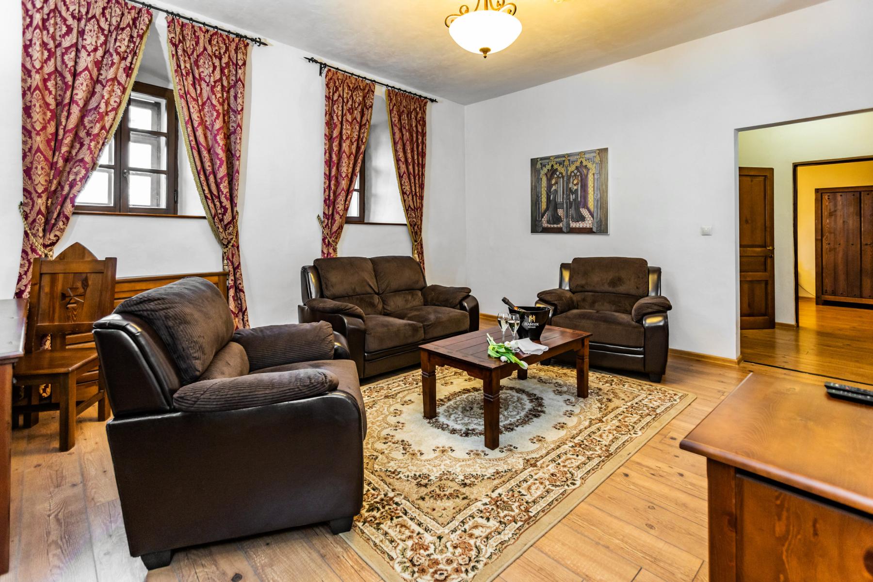 Užite si svoj pobyt na zámku v apartmáne Superior vo veľkom štýle a využite všetko, čo vám apartmán Superior ponúka. Tento apartmán sa nachádza v priľahlej Delovej bašte a je potrebné prejsť cez nádvorie do hlavnej budovy. V apartmáne s rozlohou 41 - 65 m2 si dokonale oddýchnete a načerpáte nové sily. Zariadenie apartmánu umocňuje pocit pobytu na zámku. Svojou veľkosťou sú ideálne pre rodiny s deťmi alebo pre hostí, ktorí majú radi vyšší komfort.